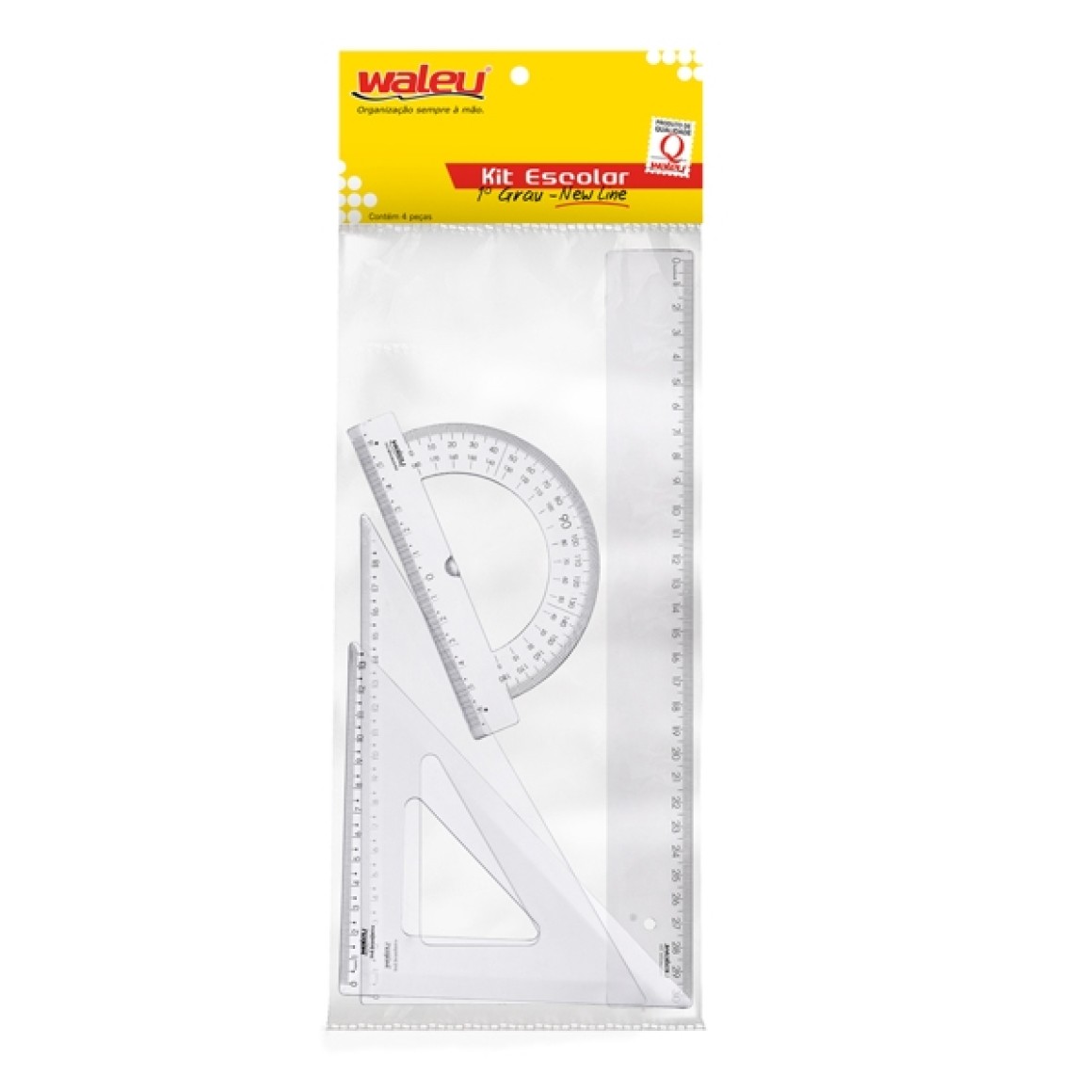 Contém: 1 Régua 30 cm, 1 Esquadro 45°, 1 Esquadro 60°, 1 Transferidor 180°