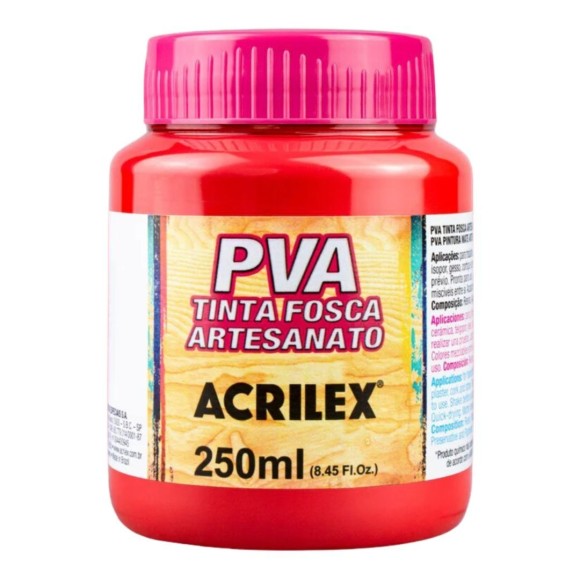 A Tinta Plástica PVA Fosca 250ml Acrilex é perfeita para dar um toque personalizado e elegante aos seus projetos artesanais! PVA Tinta Fosca para Artesanato , essa tinta é feita à base de Látex PVA , conforto um acabamento fosco e sofisticado.