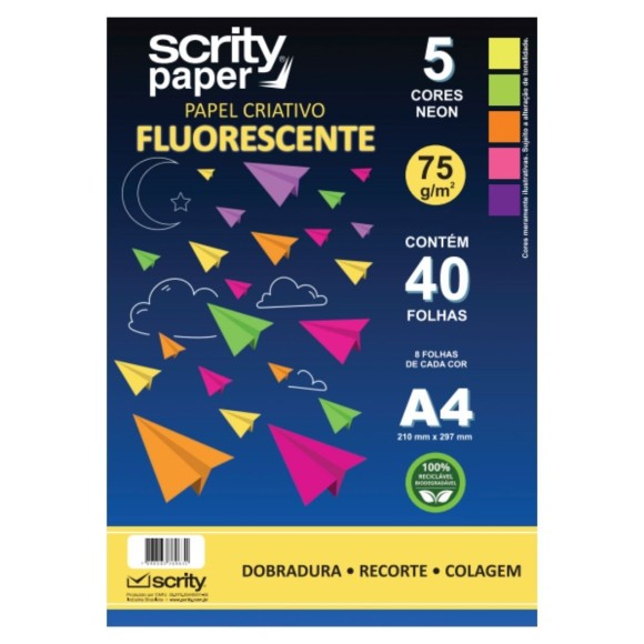 Transforme suas ideias em realidade com o Bloco Criativo Fluorescente SCRITY! Com 40 folhas em 5 cores intensas, este papel criativo é ideal para desenhos, colagens, ideal para uso escolar, profissional ou pessoal.