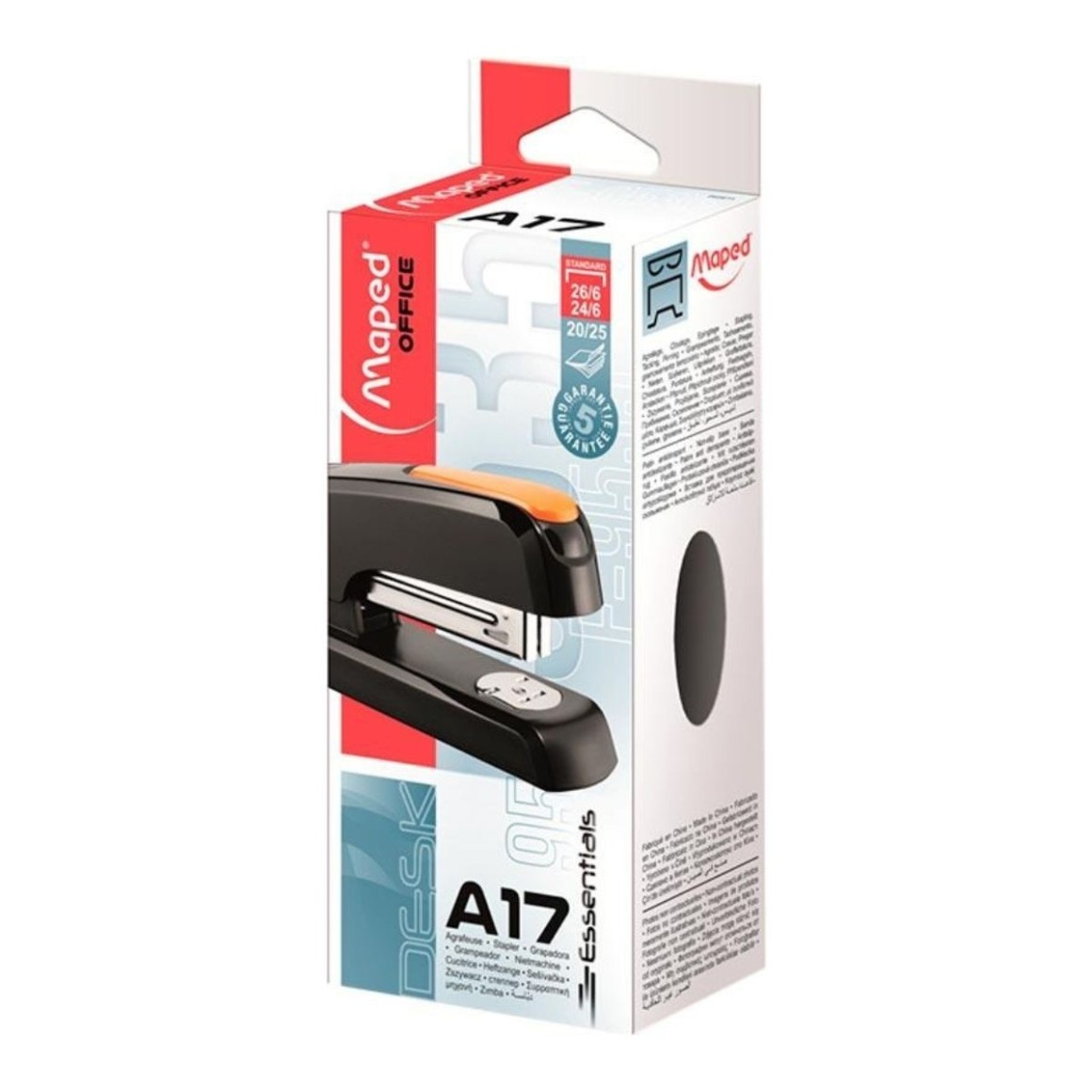 O Grampeador de Mesa Universal A17 Preto da Maped combina funcionalidade, qualidade e resistência em um design compacto e prático. Com corpo em plástico resistente e barra totalmente em metal, oferece três funções: grampear, tachear (com abertura de 180º) e grampear temporariamente. Ideal para uso em escritórios e escolas, é capaz de grampear até 25 folhas com facilidade.