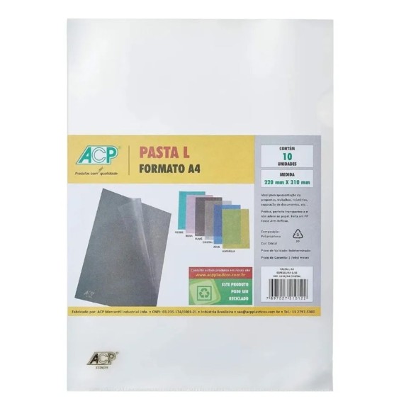 Pasta em L A4 Cristal ACP - Praticidade e Proteção em Pacote com 10 Unidades!