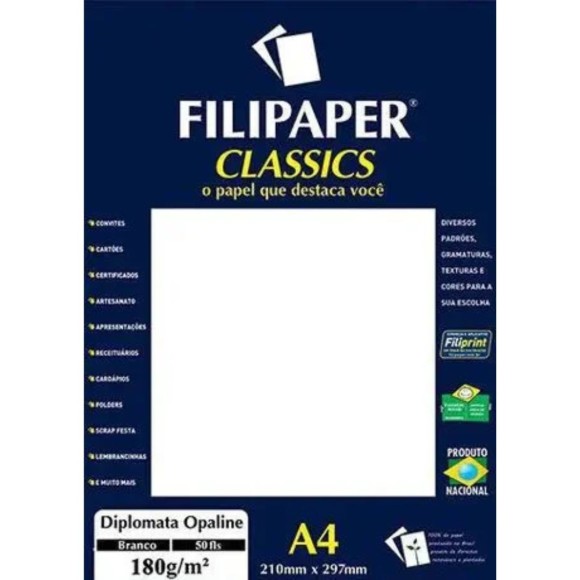 Papel 180gr Diplomata/Opaline Branco A4 C/50 Folhas FILIPAPER