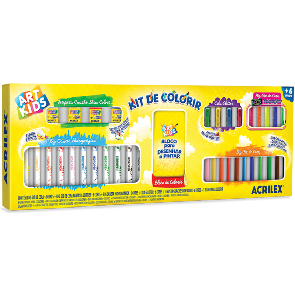 • Kit contém Big Canetas Hidrográficas com 6 cores, Big Giz de Cera Fantasia Glitter com 6 cores, Big Giz de Cera com 6 cores, Cola Glitter com 6 cores, Tempera Show Color com 6 cores e 1 bloco de colorir.